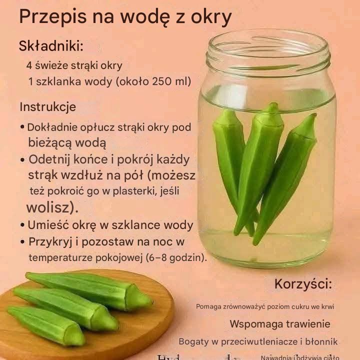 Przepis na wodę z okry – naturalny napój detoksykujący Składniki: 4 świeże strąki okry 1 szklanka wody (około 250 ml) Instrukcje: 1. Dokładnie opłucz strąki okry pod bieżącą wodą. 2. Odetnij końce i przekrój każdy strąk wzdłuż na pół (jeśli wolisz, możesz pokroić go również w plasterki). Kontynuuj na następnej stronie